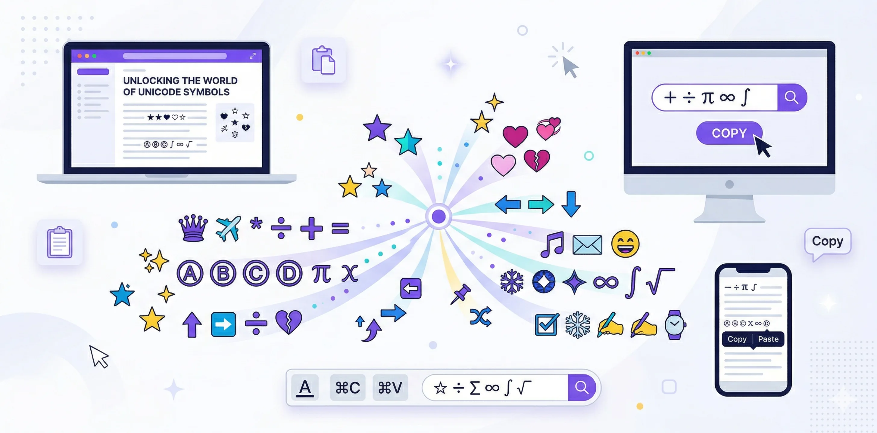 A comprehensive collection of cool Unicode symbols, decorative characters, arrows, stars, hearts, brackets, and more — all ready to copy and paste anywhere.